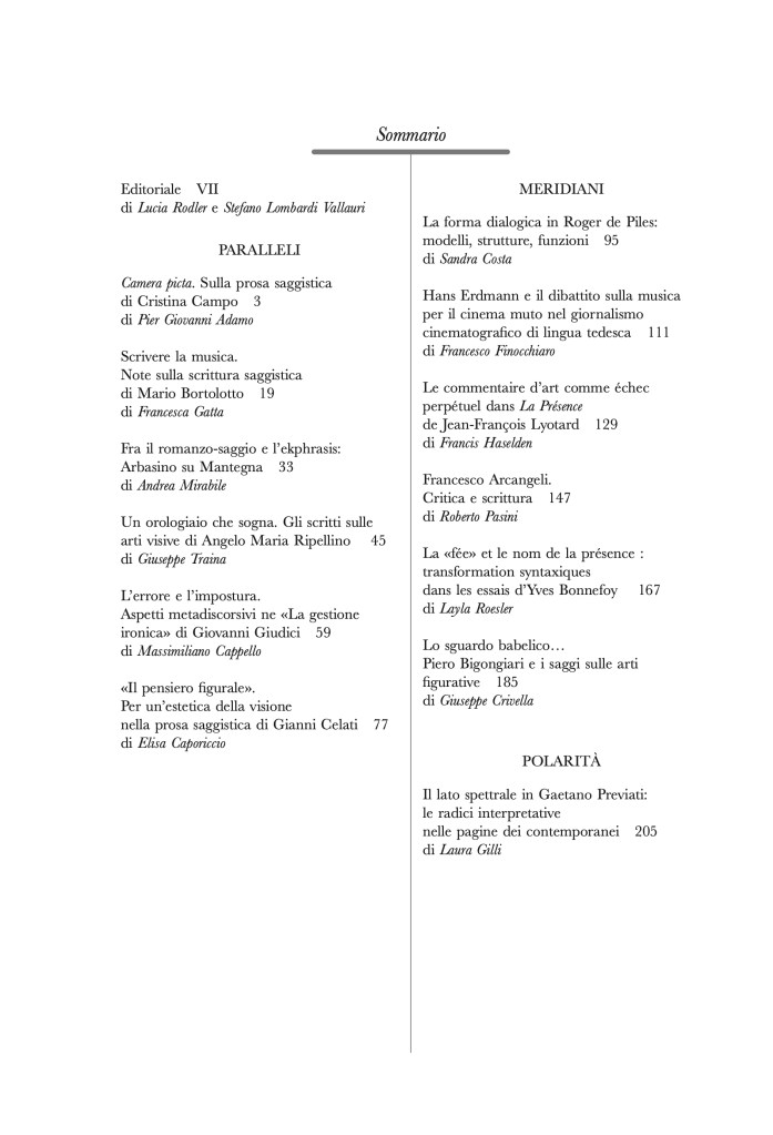 L’esegesi dello stile della saggistica critica sulle arti potrà sembrare uno strano esercizio di bizantinismo, trattandosi di un meta-meta-discorso, di un ente di quarto grado: un pensiero (l’esegesi stilistica) a proposito di un altro pensiero (la saggistica critica) concernente un altro pensiero (le opere artistiche) intendendo queste a loro volta come un pensiero sulla realtà. Un’apoteosi del metadiscorso; a dir poco, sovrastrutturale. Può darsi. Tuttavia tale esegesi ha la pretesa di non essere futile, di avere una motivazione soda, consistente: essa nasce per rendere giustizia a una concreta esperienza che smentisce la supposta irrilevanza di questa stratificazione in cui ogni successivo strato sarebbe più evanescente. Un’esperienza del genere ciascuno l’ha provata: è che talora, leggendo un saggio critico, la sostanza di ciò che leggiamo manifesta per la nostra coscienza la stessa genuinità degli strati presuntamente più diretti, la realtà e l’arte; e in particolare, il pregio di ciò che leggiamo non sta meno nello stile che nel contenuto, esattamente come per l’arte. Il meta-meta-discorso si rivolge comunque a una realtà, ancorché mediatissima, la cui vividezza e attrattiva non è talvolta meno diretta e intensa di quella della realtà immediata o dell’arte. Esiste un valore – sia estetico sia morale – di questa scrittura di secondo terzo ennesimo grado, un valore che si sostanzia propriamente nel suo stile. Non solo non è futile, è indispensabile, interrogarlo.